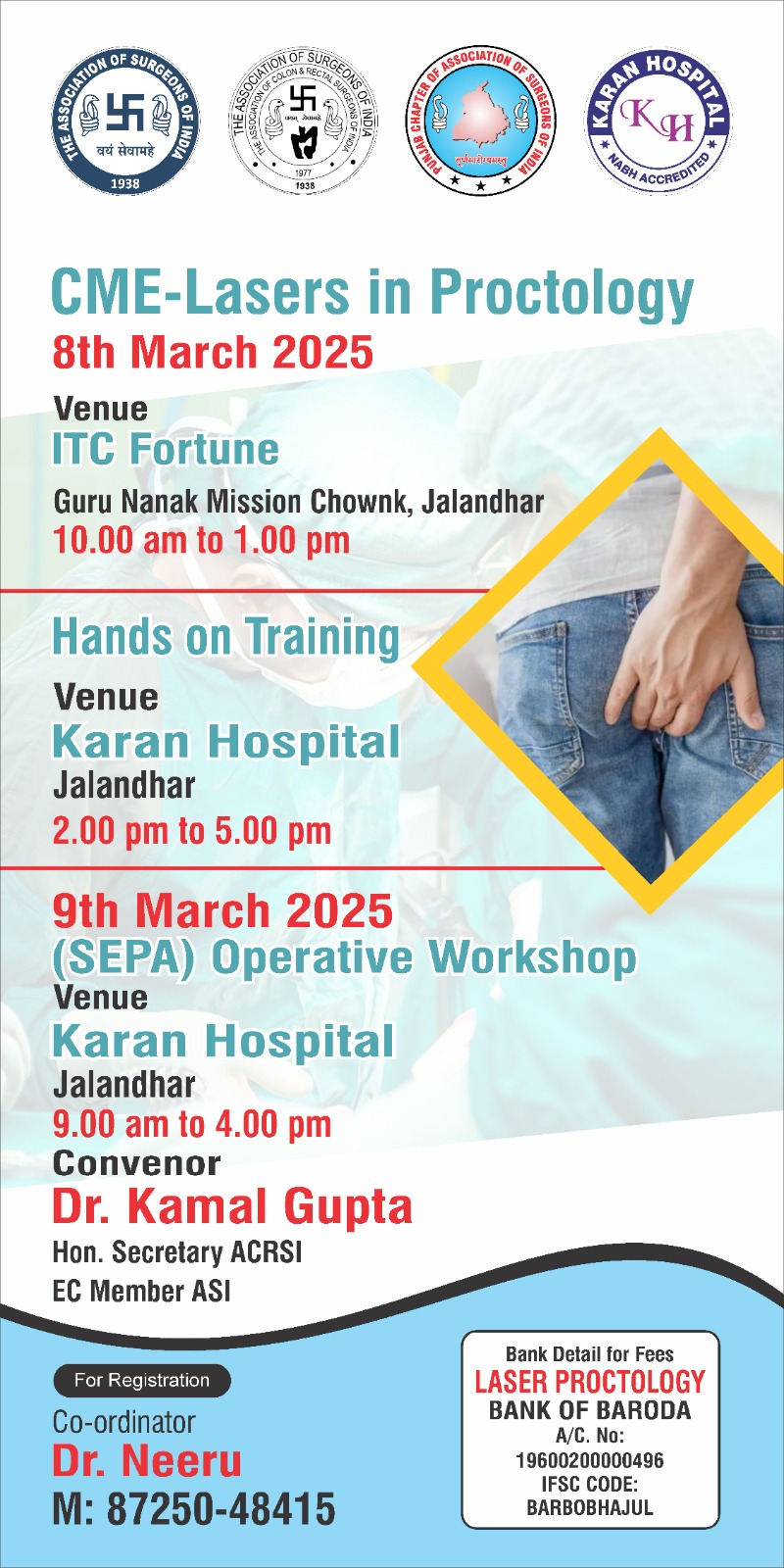 At Karan Hospital, we offer specialized proctology training programs under the Skill Enhancement Program of the Association of Surgeons of India (SEPA), which equips surgeons with advanced laser techniques for anorectal surgery. This course offers indepth training on utilizing minimally invasive techniques and lasers for treating prevalent anorectal conditions. Participants will engage in practical sessions covering laser hemorrhoidoplasty (LHP), fistula treatment (including demonstrations of ProctoCorTM and VAAFT scopes), laser lateral internal sphincterotomy, and video-assisted pilonidal sinus ablation (VALAPS).